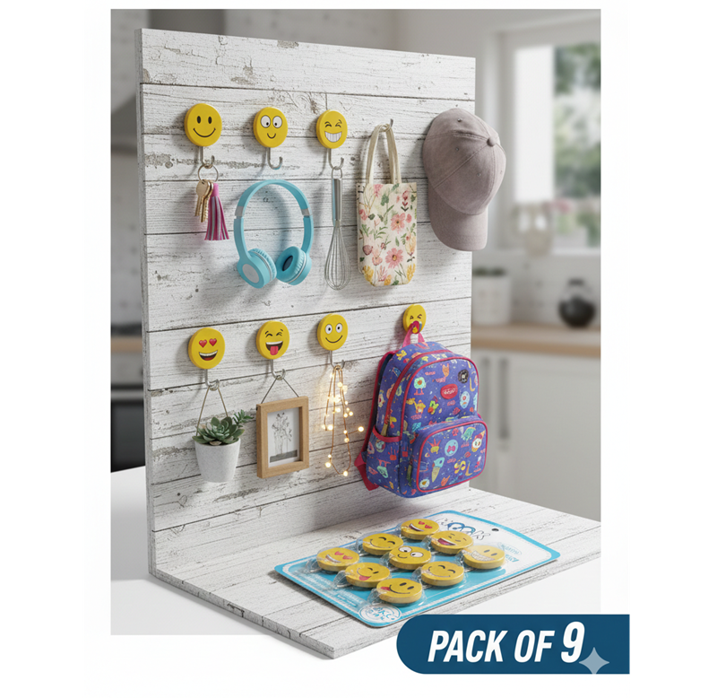 Smiley Self-Adhesive Wall Hooks – Type 2 | 9 Pcs | 2kg Load Capacity