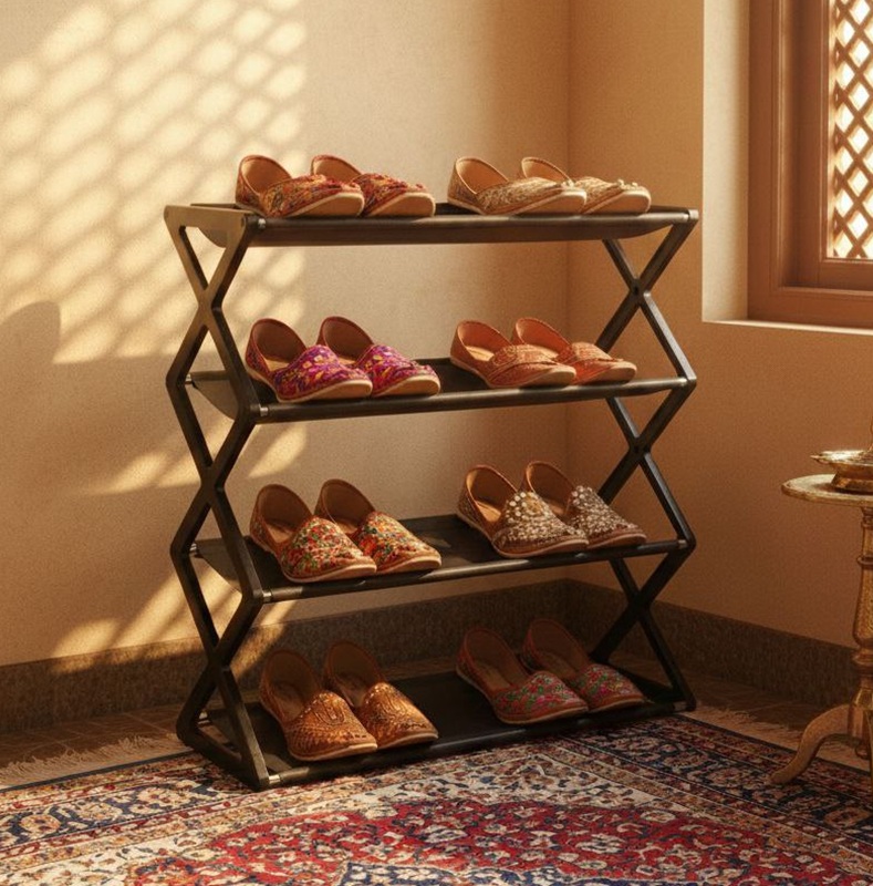 4-Tier Plastic Shoe Rack with Steel Pipe – Space-Saving Shoe Organiser | Black | Bedroom & Entryway