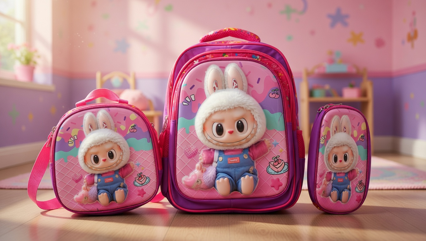 3D Pink Cartoon Kids School Backpack Set – Bag with Matching Lunch Bag & Pencil Pouch
