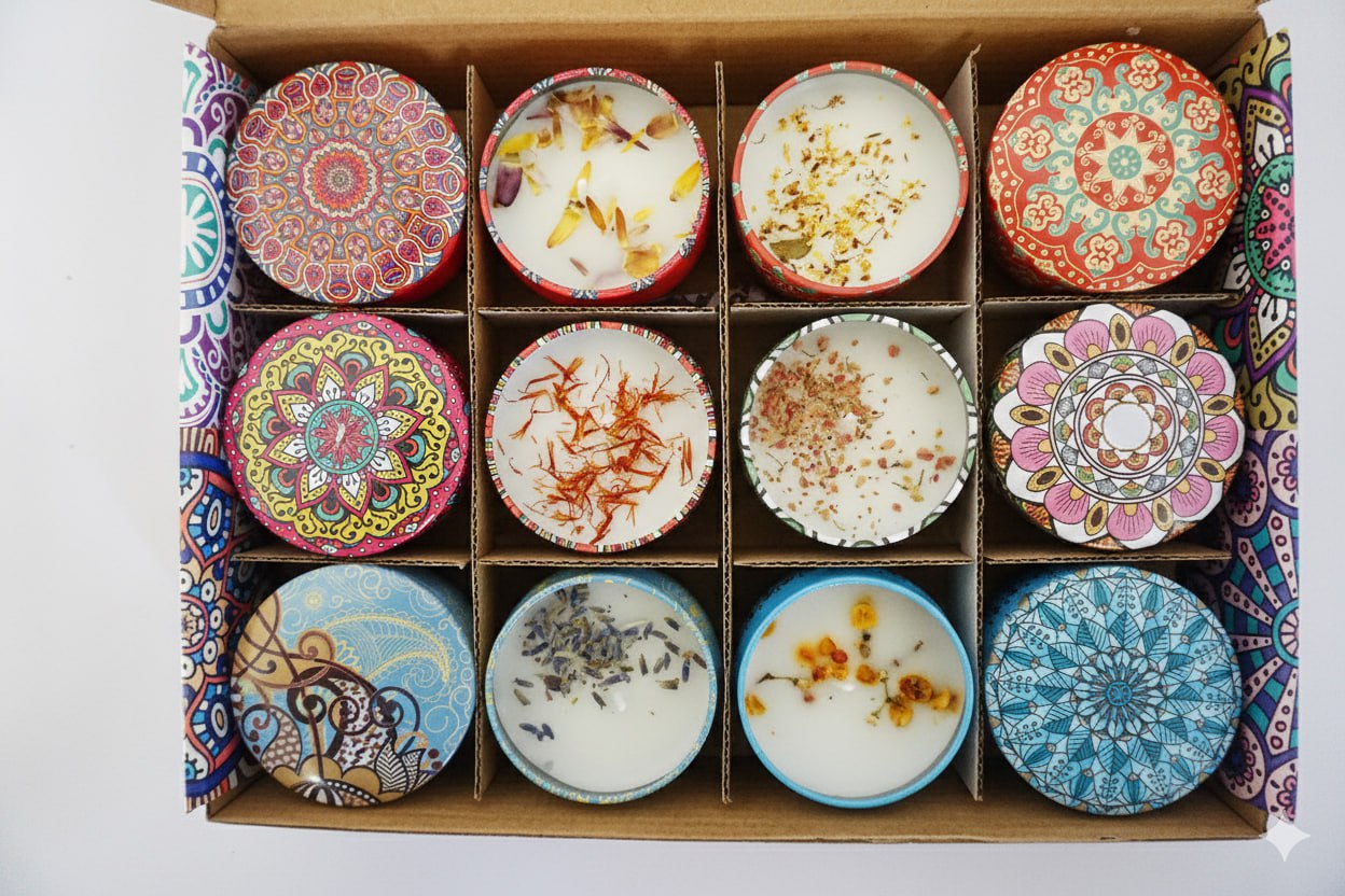 12 Pcs Printed Tin Scented Candles – Soy Wax | Diwali & Wedding Gifting