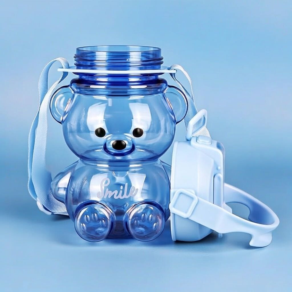 Blue Cute Teddy Bear Kids Water Bottle 1L – Push Button Sipper with Straw & Adjustable Strap
