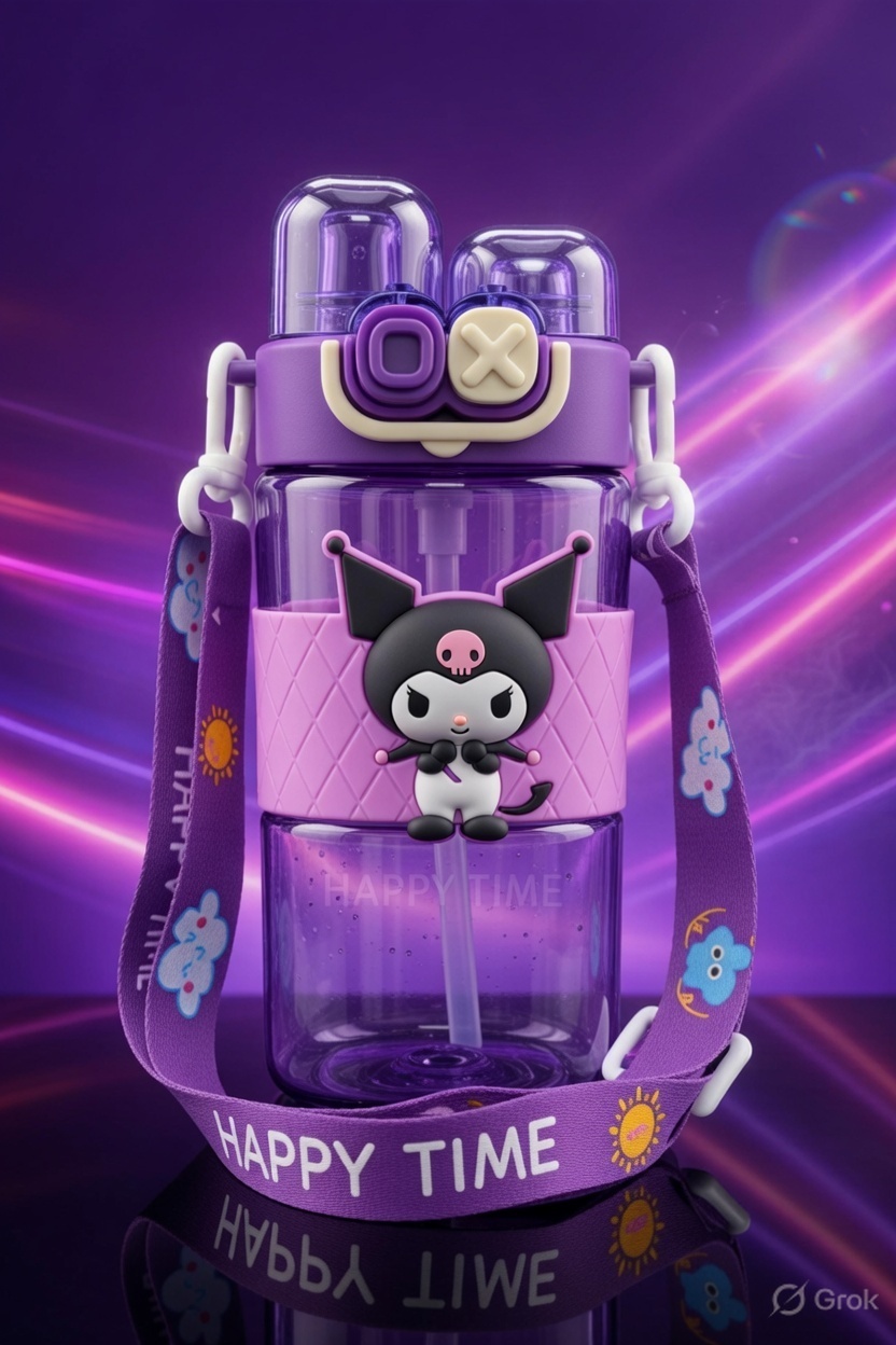 Buy Kuromi BPA-Free Sipper Water Bottle 500ml Purple. Dual nozzle with strap, for girls. Free shipping.