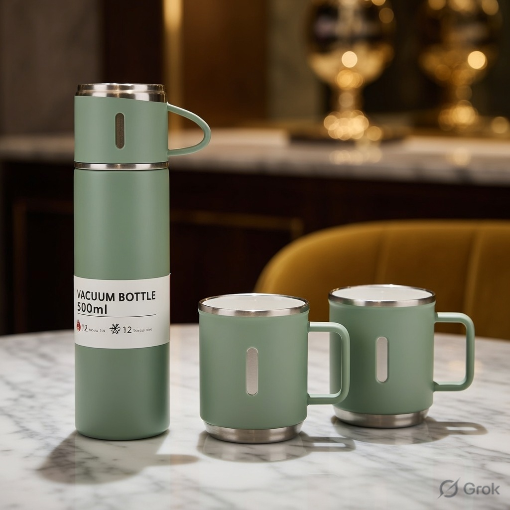 Stainless Steel Vacuum Insulated Thermos 500ml (Green) with 2 Cups – Hot & Cold | Diwali & Corporate Gift
